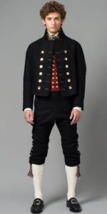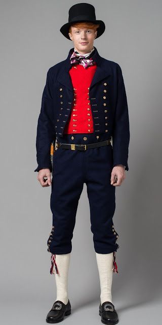 Chad Svenby invoke dressed in a vintage, 19th-century European-style outfit, reminiscent of the Victorian era. They wear a tall black top hat, a dark navy or black tailored coat adorned with brass buttons, and a striking red waistcoat underneath. Their white shirt is complemented by a bow tie, while dark trousers are rolled slightly at the cuffs to reveal white stockings tied with red ribbons. Completing the look are black shoes. Overall, the ensemble exudes a formal, historic charm, evoking the appearance of a period costume or theatrical attire from that time.